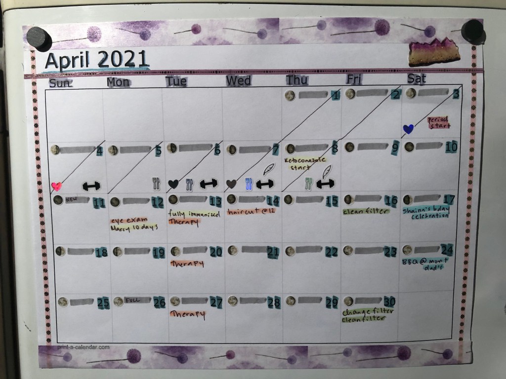 Here’s what my fridge looks like now! I made and hung up the May calendar too, so I can plan a bit ahead.