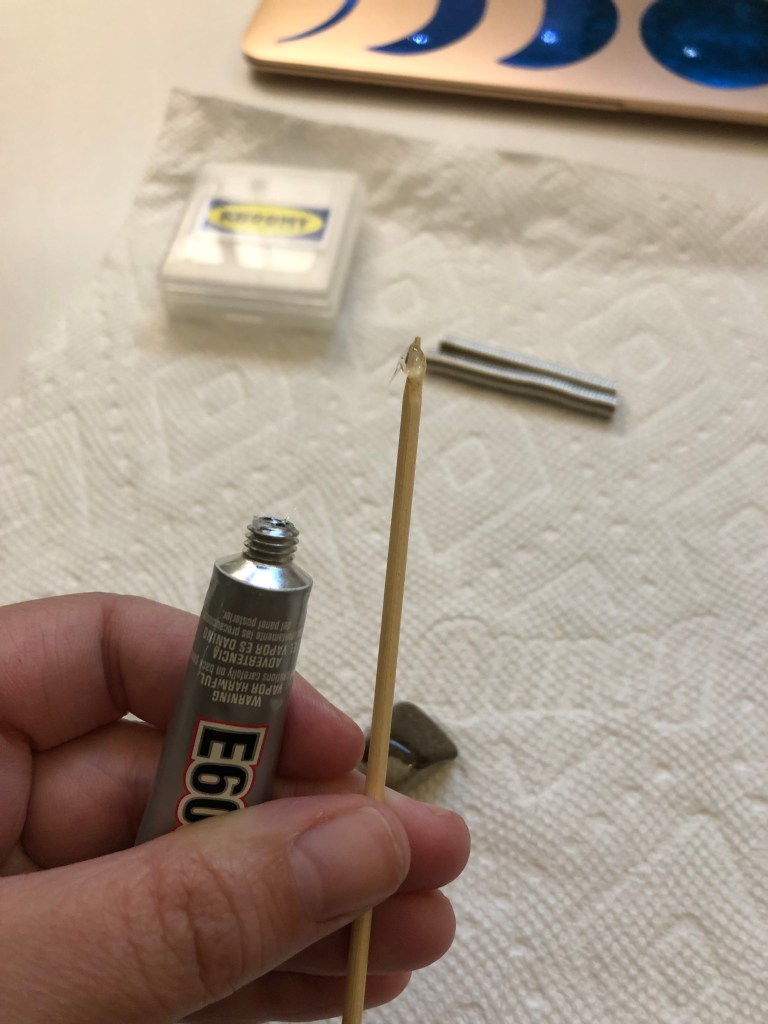 I already had some adhesive on hand from a previous project (or two, the stuff comes in handy), and I used a toothpick to apply it to the magnets.
