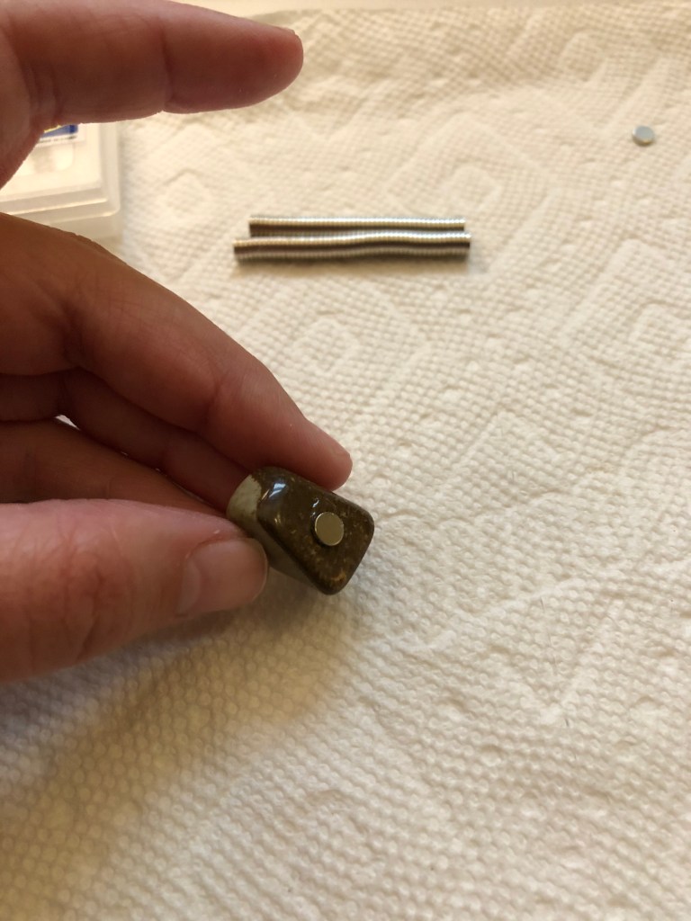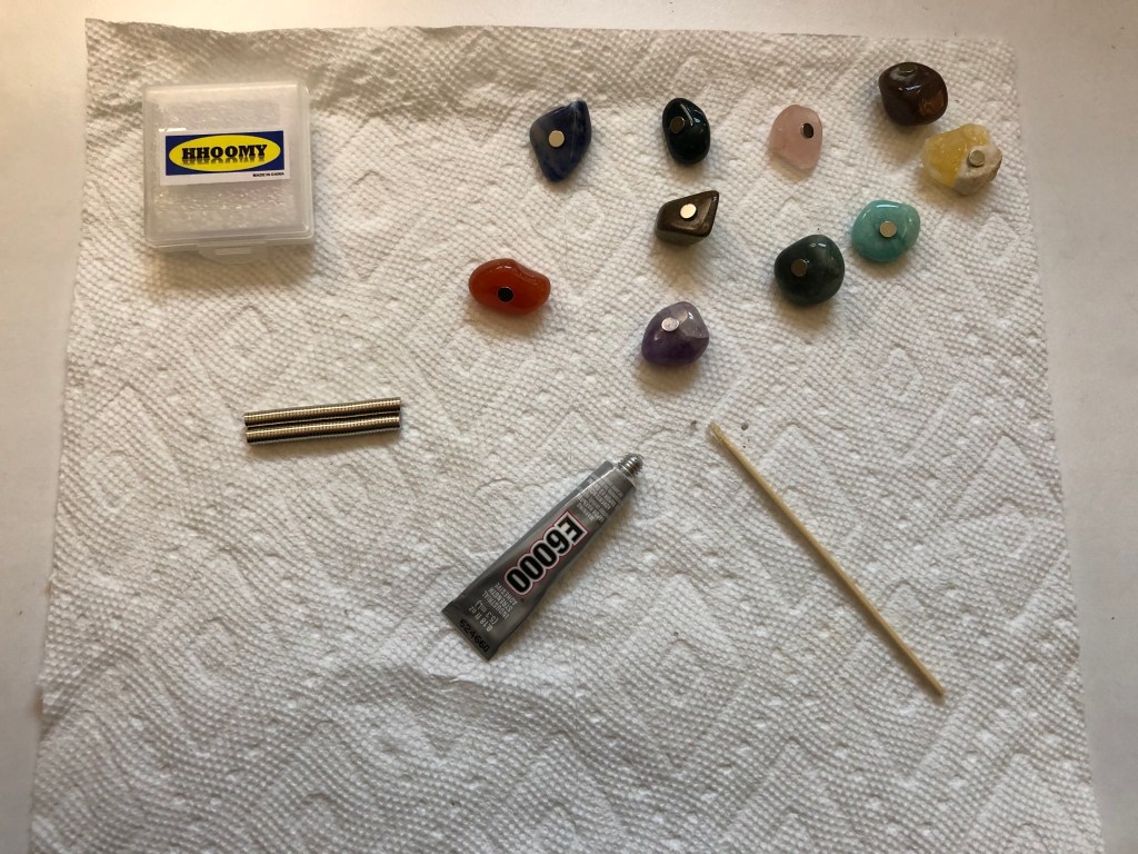 So I ordered some tiny magnets on the Site That Will Not Be Named (you know the one, huge mega-corporation that abuses its workers but also hooray for two-day shipping) and popped over to a local metaphysical store to buy some little crystals. I stuck to the ones that were a dollar each to keep the project cheap.