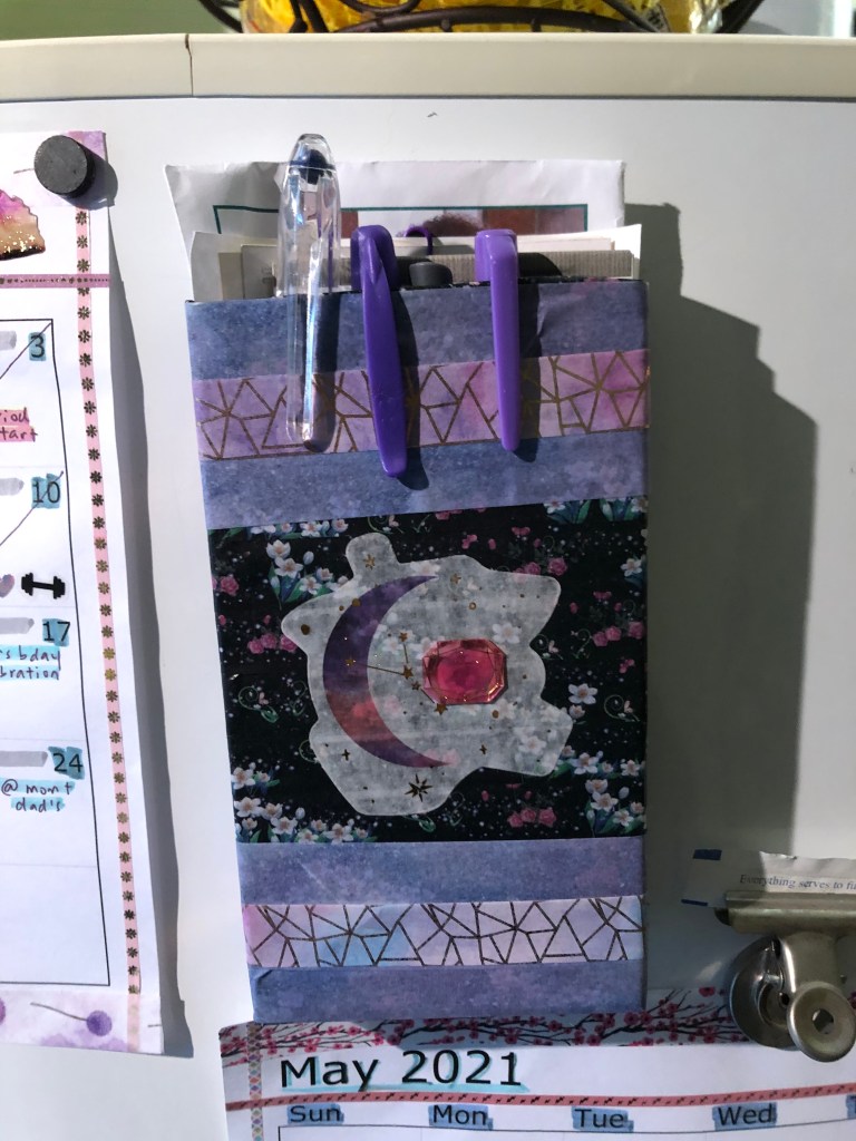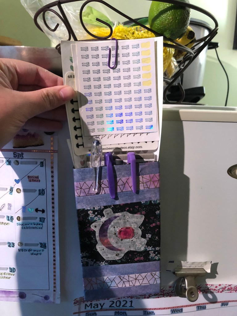I keep my stickers in a little magnetic thing-holder I DIY’d a couple weeks ago, which is also stuck to my fridge–along with some pens and other assorted stuff I like to keep handy but don’t want my cats knocking off the counters. It’s made out of an empty Sweet Tarts box, washi tape, and a couple magnets.